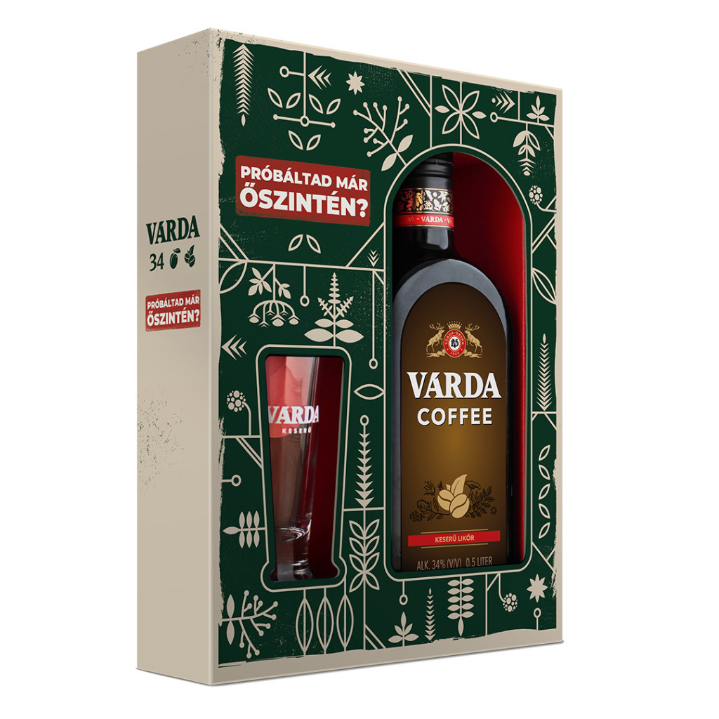 Ebben az ablakos díszdobozban a termék mellett egy 1 db logózott ajándék shotos pohár is található. A dobozon található design elemek stilizált gyógy- és fűszernövények leveleit mintázzák. A fő látómezőben kapott helyet a Várda márka szlogenje a "Próbáltad már őszintén". A doboz hátoldalán megtalálható a Várda Likőr 34% 0,5L, Várda Szilva Likőr 34% 0,5L és Várda Coffee Likőr 34% 0,5L termékek képei is.
